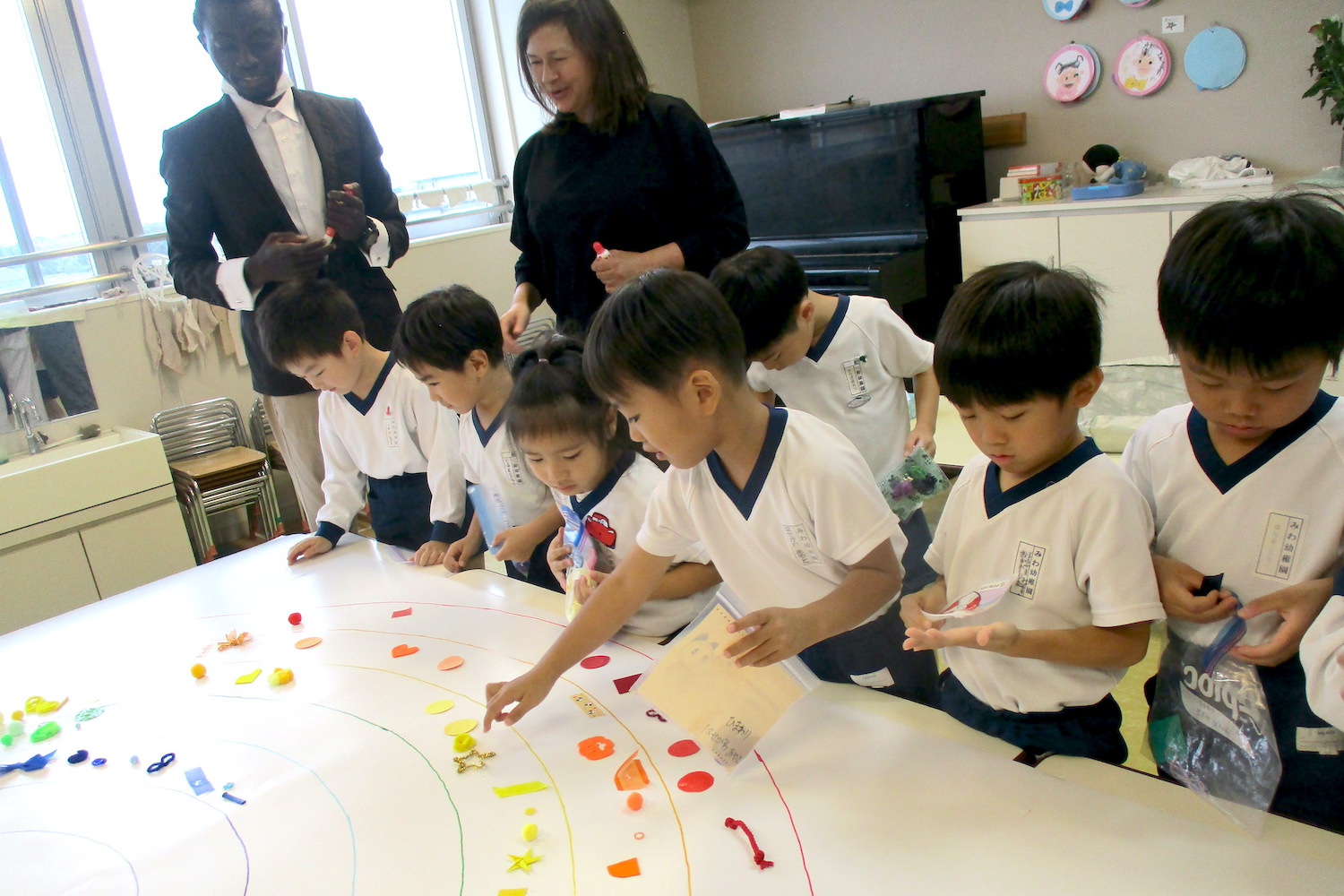 虹色プロジェクトを実施中 皆がもってきてくれた色で虹色を作りました!