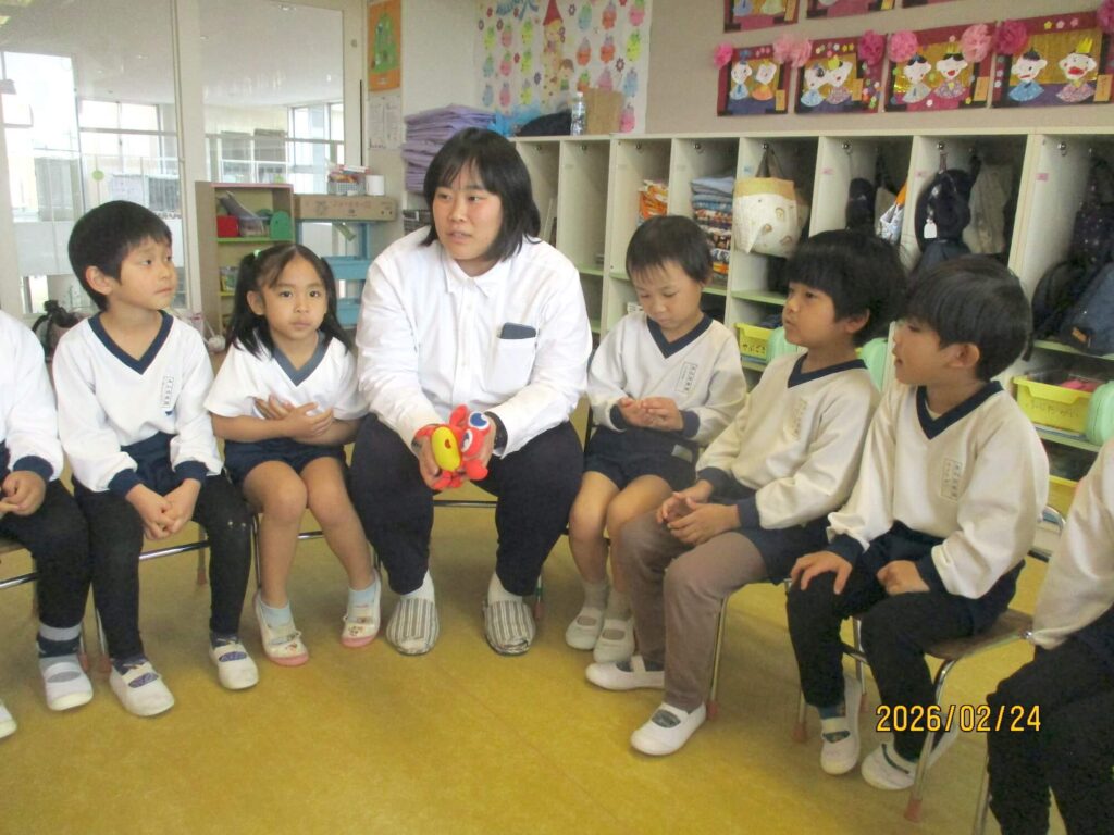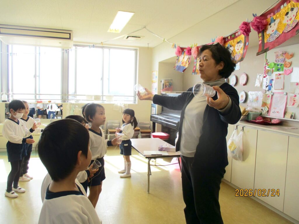 年中 STEAM教室 福祉大の先生達と一緒に、【声】について実験しながら学びました 最初に風船を使って、声の振動を知り、その後糸電話を作りました 作ってみて、どう思ったのかをみんなで丸くなって話し合いをしました